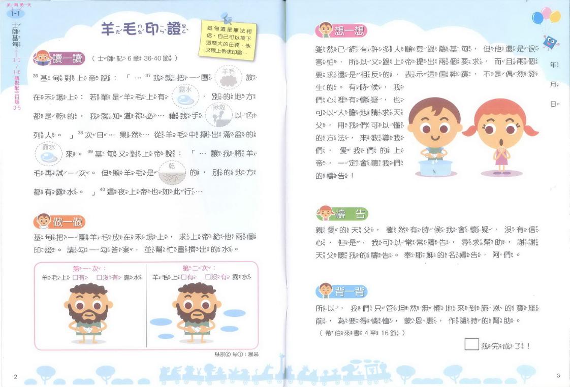 讀一讀:父母帶著孩子細讀一小段聖經,並在關鍵字貼上貼紙,增加印象。做一做:以繪圖、連連看、貼紙遊戲等,複習經文重點或含意。想一想:思考聖經含意,聯結孩子的生活經驗。背一背:背誦相關經文,印證上帝的應許。禱 告:禱告中與天父約定,把學習加入行動中。悄悄話:故事背景簡易說明或做相關的延伸,作為給家長的補充教學。