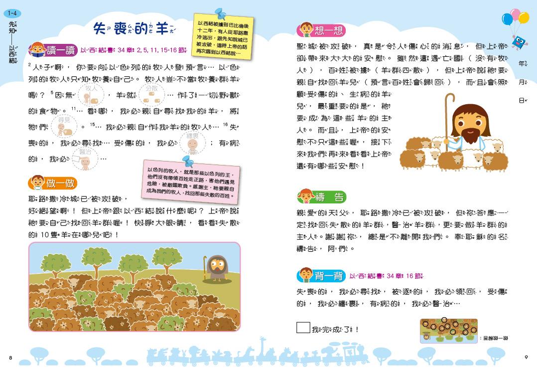 讀一讀:父母帶著孩子細讀一小段聖經,並在關鍵字貼上貼紙,增加印象。做一做:以繪圖、連連看、貼紙遊戲等,複習經文重點或含意。想一想:思考聖經含意,聯結孩子的生活經驗。背一背:背誦相關經文,印證上帝的應許。禱 告:禱告中與天父約定,把學習加入行動中。悄悄話:故事背景簡易說明或做相關的延伸,作為給家長的補充教學。