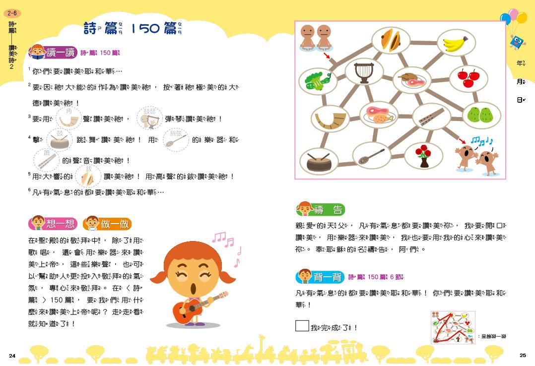 讀一讀:父母帶著孩子細讀一小段聖經,並在關鍵字貼上貼紙,增加印象。做一做:以繪圖、連連看、貼紙遊戲等,複習經文重點或含意。想一想:思考聖經含意,聯結孩子的生活經驗。背一背:背誦相關經文,印證上帝的應許。禱 告:禱告中與天父約定,把學習加入行動中。悄悄話:故事背景簡易說明或做相關的延伸,作為給家長的補充教學。